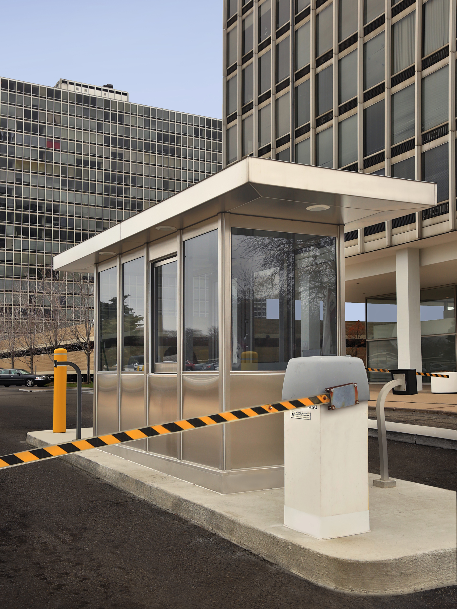 This 4’4” x 10’10 parking booth, also known as prefabricated security booth or prefab security booth includes stainless steel exterior, tinted/insulated glass, two sliding doors, Combo HVAC unit, recessed can lights in roof overhang.