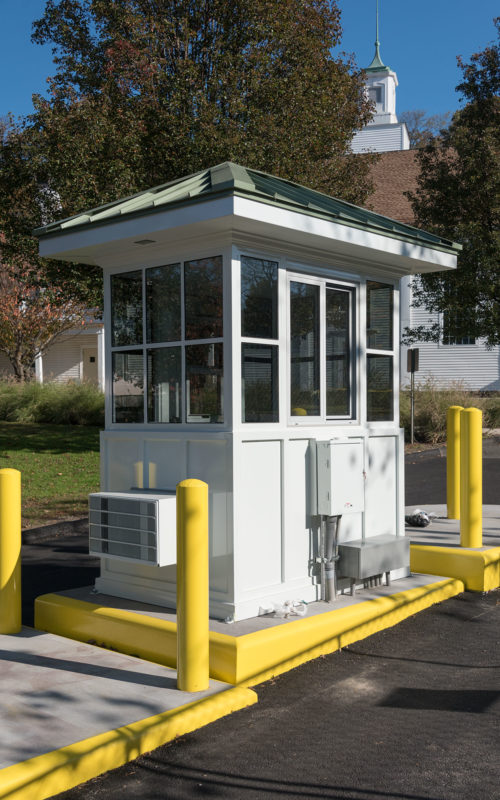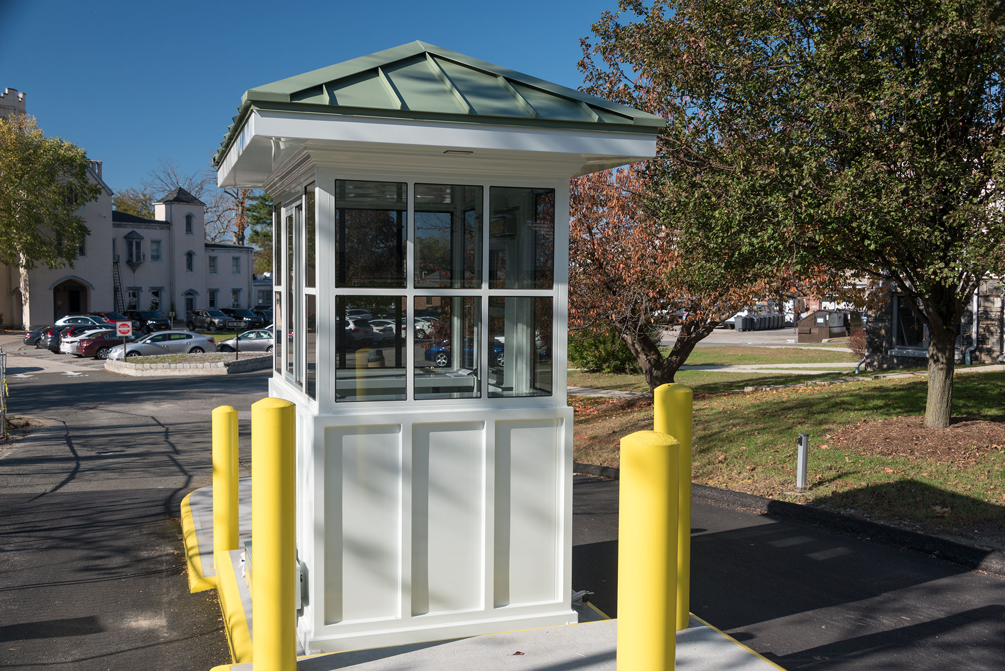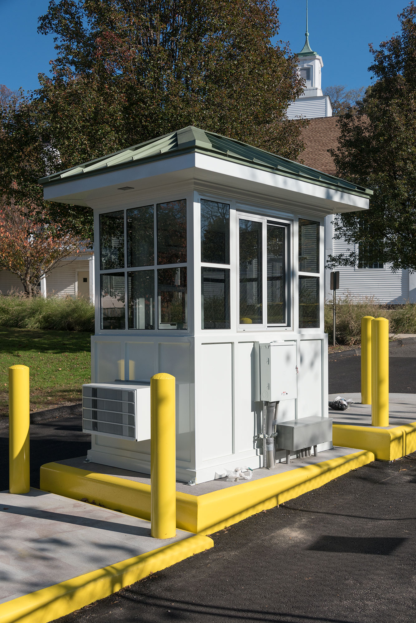 Chosen to be the traffic control booth at the main campus of St. Christopher’s School in Dobbs Ferry, New York, this 4’ x 7’ Par-Kut PRESIDENTIAL Series booth is a great looking addition to the campus. The school caters to young people from the greater New York city area and includes both residential and educational buildings. The Par-Kut guard booth helps shelter the security officers while they control access to the facility, provide information of visitors and at the same time, protect students, faculty and administrators. The prefab booth has decorative window mullions and a premium standing seam metal roof..